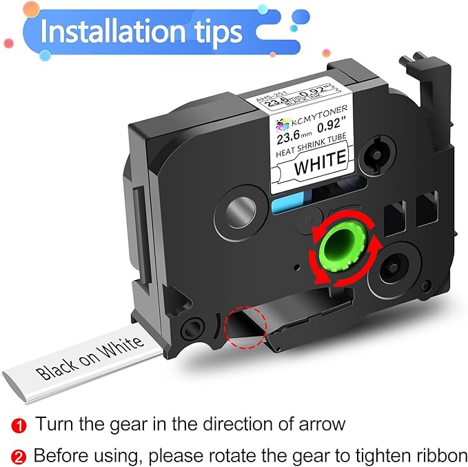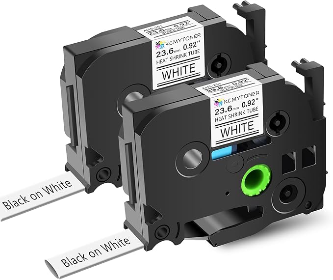 - Package Included: 2 pack KCMYTONER compatible for ptouch HSe-251 HS-251 HSe251 HS251 heat shrink tube label tapes; color: black text on white tape; size: 1 inch (23.6mm, flattened width) x 4.92 feet (1.5m).The size indication for this heat-shrink tube label is the width of the flattened tube as a label in a label printer. Do be aware that the size given relates to the label making machine, not the wire. HSe-251 23.6mm tube suits cables ranging from ฮฆ7.3mm to ฮฆ14.3mm in diameter.