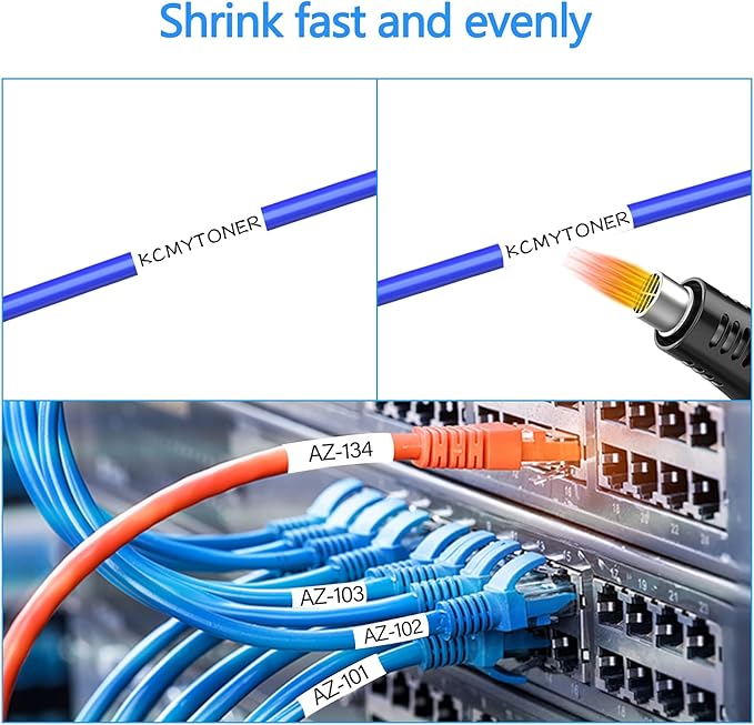 - Labeling cables more efficiently and easily: Tapes featuring shrink ratio of 2:1 which ensures a secure fit on wires and cables. You just need to slide the tube onto the wire/cable and shrink snugly to the cable with a heat gun, labels will shrink up perfectly to the wires and never curl or fall off