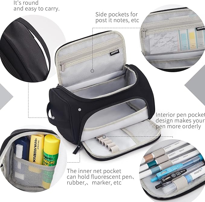- 【Unique Design】Opens sideways (for easy-view and accessed) or from the top. Easy to carry, hand-held band. The Zipper grid pocket on top can storage triangle ruler, refills; big inner pocket can classify calculator,small pockets on both sides can keep small notes, sticky tape erasers; back zipper pocket can hold sharp objects.
