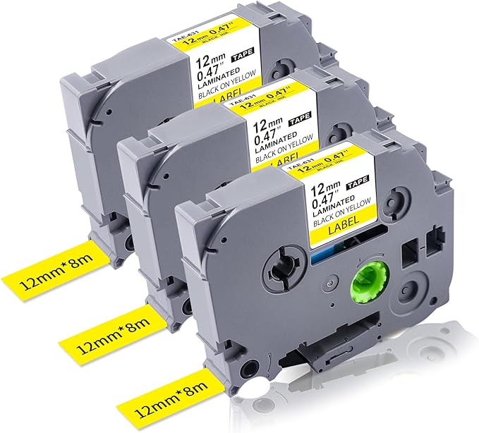 - 3 packs. Lonitul TZ tape 12mm yellow replacement for Brother P Touch label tape TZe-631, black on yellow, 1/2" (12mm) x 26.2ft (8m) of each tape.