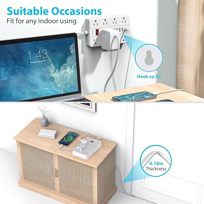 - Multi Outlets Power Strip:8 AC outlets 6 USB(1USB C)power strips with 1080 joule surge protection to protect your high-end electronics from sudden power surges and spikes,integrated circuit breakers will automatically trip to protect your devices when the power is overloaded