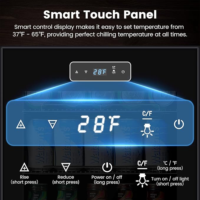 - 【Temperature Memory Mastery】Our sleek beverage cooler sports an intuitive touch display, making it a breeze to dial in your ideal temperature. If the power suddenly cuts out, no worries – it snaps right back to your set temp. This nifty trick stops cans from going bad when the heat rises and keeps every bottle and can at a uniform humidity level. What's more, the fridge defrosts on its own, so you can sip your beverages without a hitch and enjoy pure refreshment