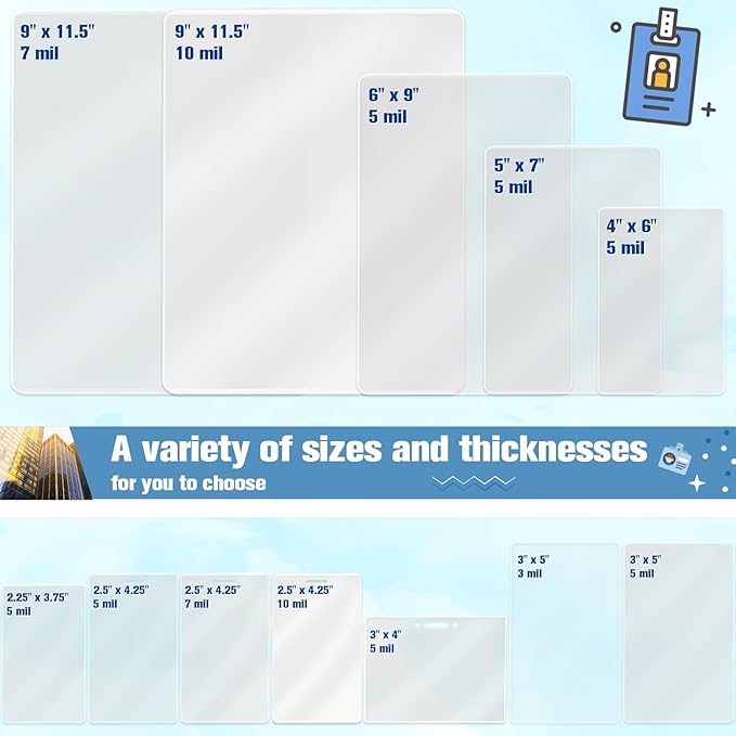 - Multipurpose:Clear laminating pouch suitable for companies, schools, shopping malls, hospitals, governments, etc., It can be used for back to school backpack tag give away,laminate book bag tags for students,make ID cards for employees,factory badges, luggage tags, student ID cards, exhibition cards, etc.