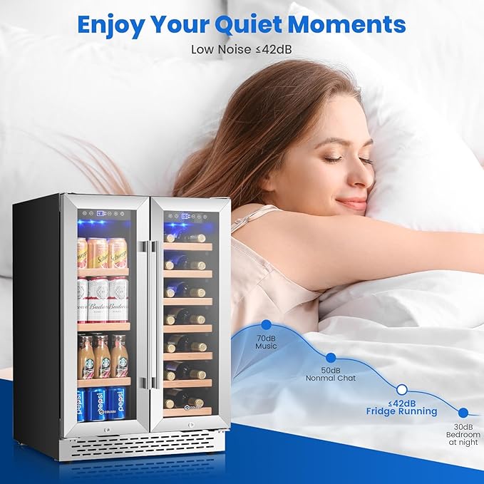 - 【Installation Options Built-In& Freestanding】The 24-inch wide wine and beverage fridge offers flexible installation choices. It can be installed as a built-in unit underneath a counter or used as a freestanding appliance.Note: After receiving the package, please let it sit for one day before turning on the fridge