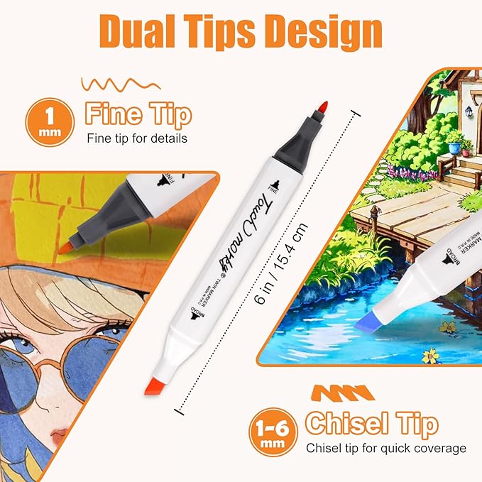 - FAST DRYING & HIGH QUALITY: Our fancy markers set with app use alcohol as the solvent, which dries quickly, making them ideal for artists. The broad tip of the marker is 1-6mm and the fine tip is 1mm, giving you versatility in creating your artwork