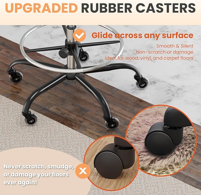 - COMFORTABLE TALL OFFICE CHAIR: This high drafting chair has soft and thick seat to add comfort for your seating; smoothly adjustable height & footrest to adapt your different using senses; and upgraded rubber wheels to avoid noise and scratching of your floor. We made upgrade designs and insist on high quality materials to offer users better experiences.