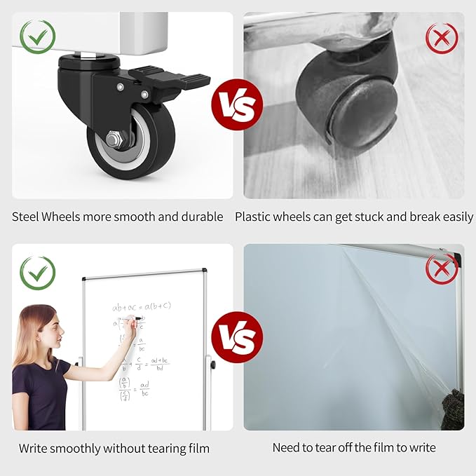 - Robust and Mobile: Built with a sturdy aluminum frame and four steel casters, our whiteboard ensures smooth 360Β° rotation and easy mobility. Engage the brakes for added stability during use.