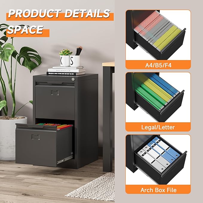 - 【Sturdy and Durable】Metal file cabinet drawers crafted from steel material, designed to be durable and suitable for all your storage needs. With a powder coating process that bonds and bakes the protective coating to the bare metal, the 2 drawer file cabinet with lock forms an effective barrier against corrosion.