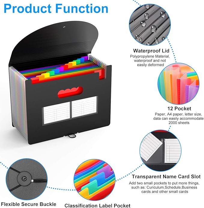 - 📂【EXPANDABLE & HIGH CAPACITY】-The file organizer keeps each slot's papers separated and organized in a good manner. 12 pockets expandable file folder. Product Size: Length: 13” High: 9.25'', width:1.06"-12". Expandable property gives it a possibility to hold approximately 2000 A4 sheets.