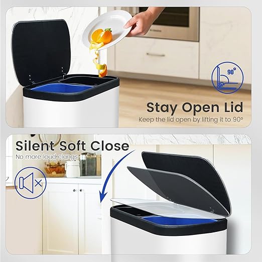 - What You Get: A dual trash can sized at 22.05”L x 16.54”W x 26.57”H with 2 x 8-gallon compartments, plastic inner buckets, and a soft closure mechanism for easy waste disposal.