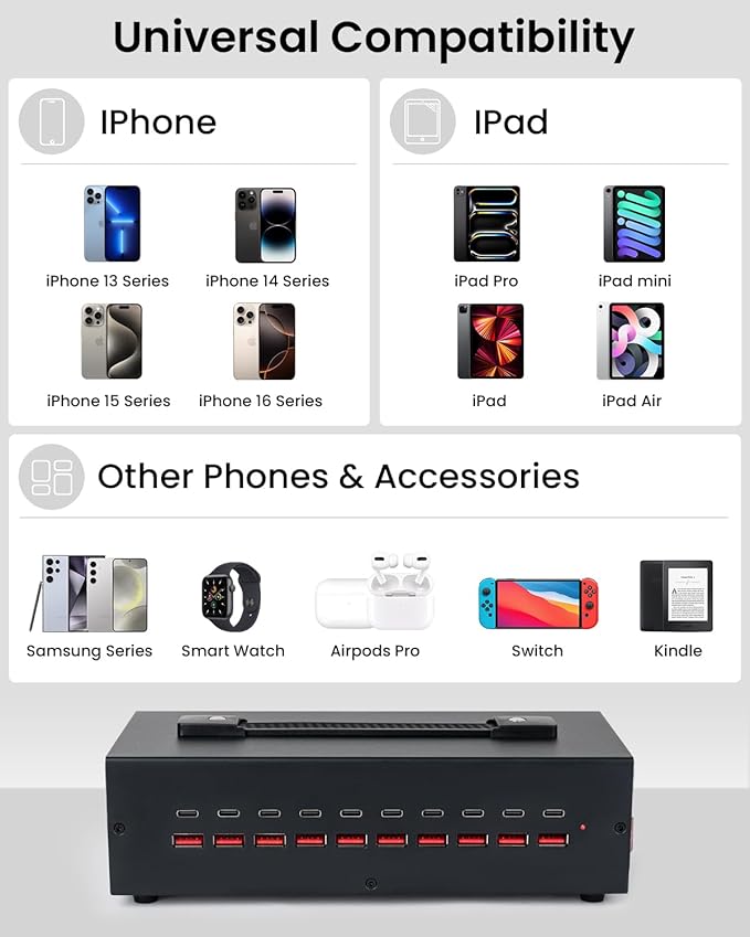 - Universal Compatibility: Designed for fast and safe charging, this multi device charging station is compatible with iPhones, Android phones, tablets, power banks, laptops, headphones, and other USB-enabled devices. Compatible for iPhone 15/14/13/12 Pro Max, iPhone SE, iPhone 11, iPhone X/XR/XS/XS Max, iPhone 8/7/6, iPad, iPad air, Table, Kindle, Sumsang Galaxy, Motorola, HTC, LG and more.