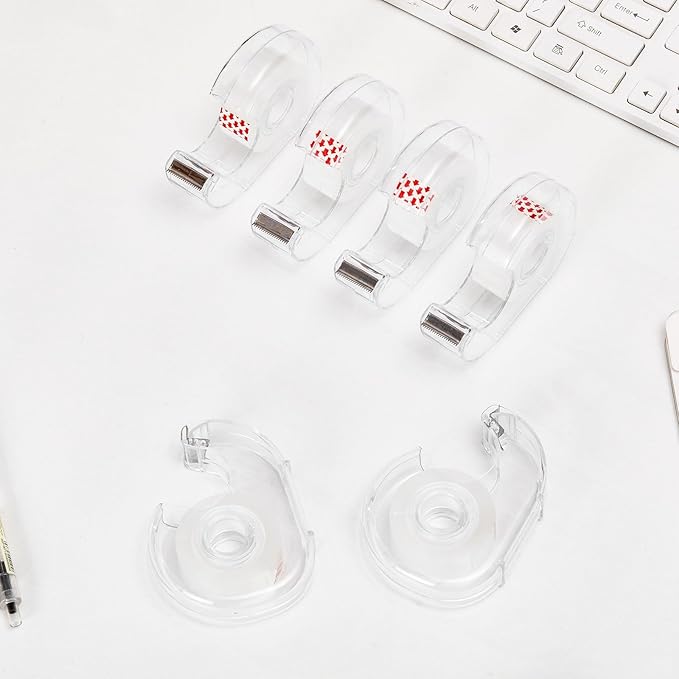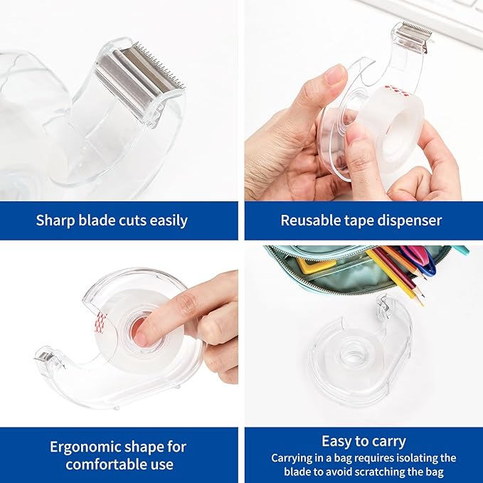 - REUSABLE TAPE DISPENSER: Can be refilled with new tape after using the supplied tape. This tape holder is suitable for cutting 3/4 inch transparent tape and invisible tape, tape core must be greater than 1 inch inside diameter, less than 3 inches outside diameter, and less than 0.8 inches wide.