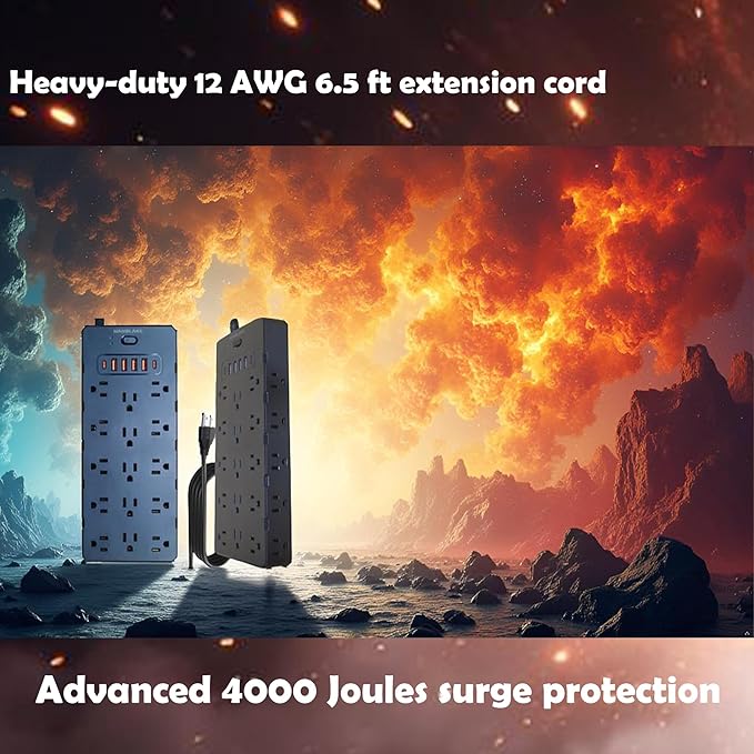 - 20 Amp Power Strip Surge Protector with 25 AC Outlets and 6 USB Ports, ensuring all your devices are powered and charged efficiently.