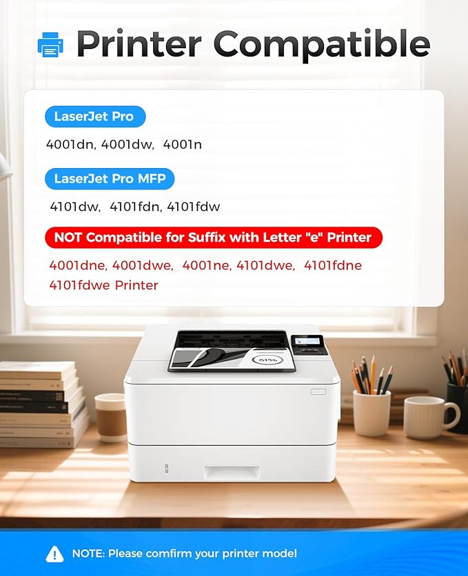 - Compatible Printers: Compatible with HP LaserJet Pro 4001dn 4001dw 4001n,HP LaserJet Pro MFP 4101dw 4101fdn 4101fdw Series Printer. NOT Compatible for Suffix with Letter ""e"" Printer. such As:NOT Compatible for HP LaserJet Pro 4001dne,4001dwe,4001ne Printer. such As:NOT Compatible for HP LaserJet Pro MFP 4101dwe,4101fdne,4101fdwe Printer.