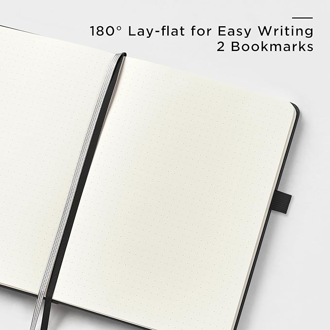 - 180Β° LAY-FLAT DESIGN: The lay-flat design allows for easy writing and ensures that you can utilize every page efficiently. Journaling, note-taking and planning has never been easier! 2 Bookmarks to help you find important content faster!