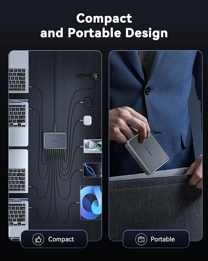 - Widely Compatibility:This Rocoren GaN charger supports a maximum output power of 100W on the C1 and C3 ports, a maximum output power of 65W on the C2 and C4 ports and a maximum output power of 45W on the C5 port. The usb c charger station also supports most fast charging protocols such as PD3.0, QC4.0, QC3.0, QC2.0, AFC, FCP, PPS, etc. compatible with MacBook Pro 16", 14", 13", MacBook Air, Dell XPS, compatible with iPhone 16,15 Pro/14 Pro Max/13/12, Samsung Galaxy S25 Plus/S24 Ultra/ S23 /S22, Moto G51/Razr 50 Ultra,OnePlus 13/Ace 3/5Pro,for iPad Pro, iPad Air Series AirPods Pro,for AppleWatch,Switch, Steam Deck and more