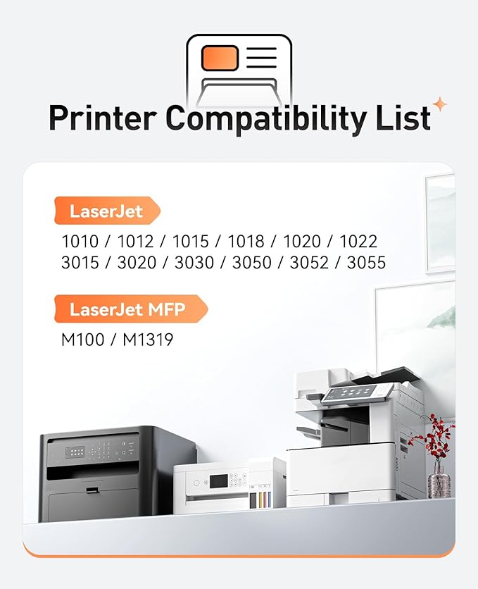 - Compatible Printer: Compatible with HP LaserJet 1010,1012,1015,1018,1020,1020 Plus,1022,1022n,1022nw,3015,3020,3030,3050,3050z,3052,3055,LaserJet MFP M1005,M1319f Printer.