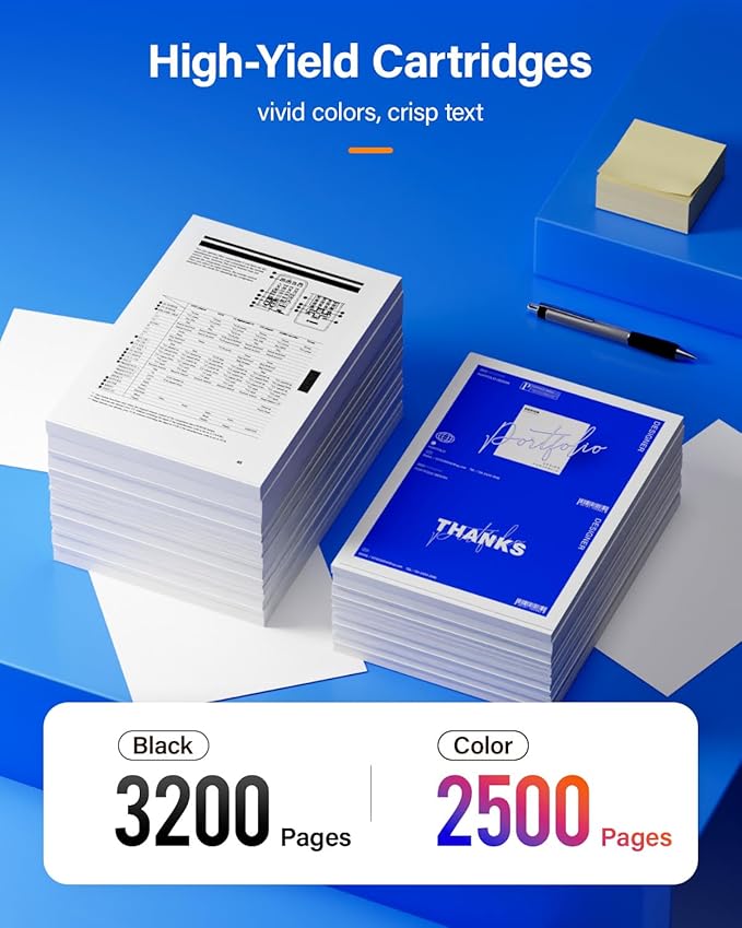 - 【Page Yield】Up to Black is 3,200 pages per black cartridge and Color is 2,500 Pages per color cartridge (Letter/A4, at 5% Coverage).
