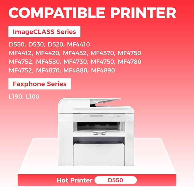 - Compatible Printers: Compatible with Canon ImageCLASS Series:D550 D530 D520 MF4410 MF4412 MF4420 MF4452 MF4570 MF4750, ImageCLASS Series:MF4752 MF4580 MF4730 MF4750 MF4780 MF4752 MF4870 MF4880 MF4890, Faxphone Series:L190 L100 Series Pprinter.
