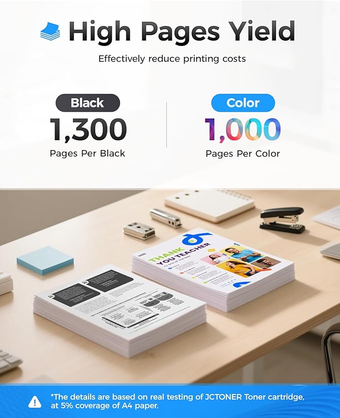 - High-Yield: up to 1,300 pages per 130A Black and 1,000 pages per 130A Color (Total 4,300 pages, 5% coverage)