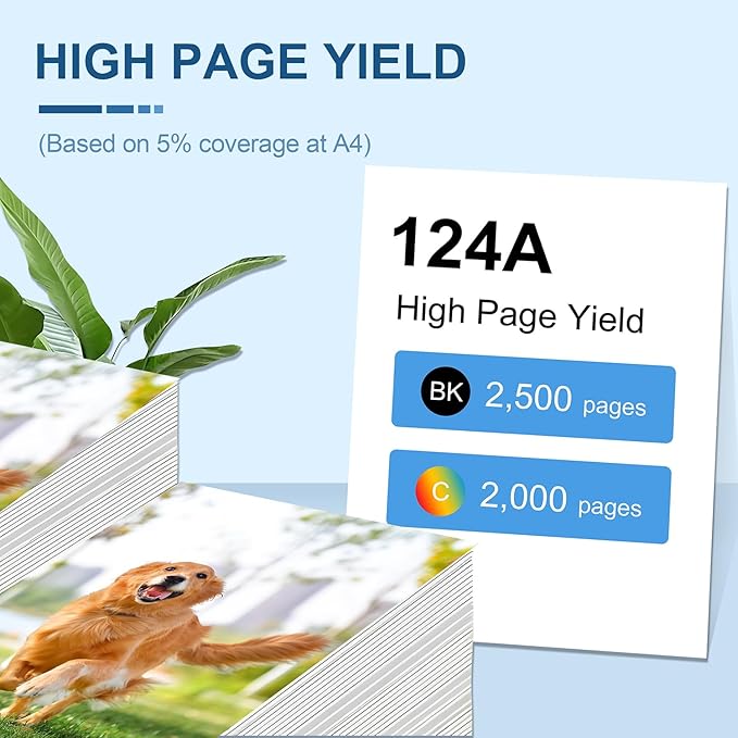 - Expected Page Yield: 2,500 Pages for 124A Black Toner Cartridge, 2,000 Pages for 124A Cyan/Yellow/Magenta Toner Cartridge (Letter/A4, at 5% Coverage)