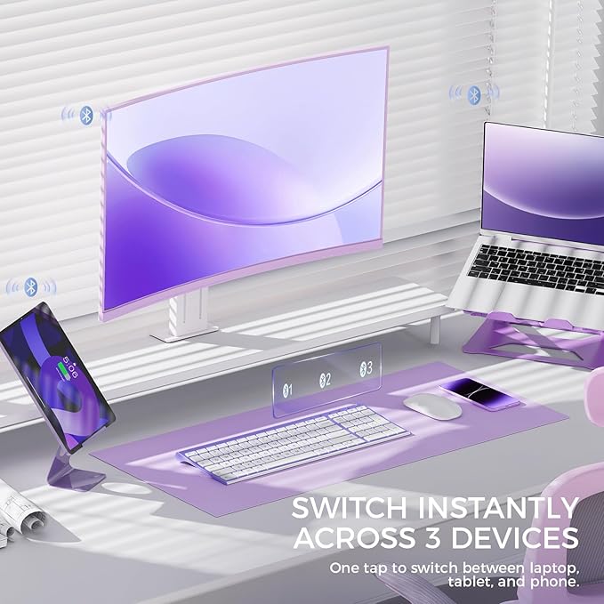 - Keyboard Description : Slim, compact Bluetooth keyboard with chic lavender top and soft white keys, quiet low-profile scissor-switch keys (<50 dB), 3-device pairing with quick-switch buttons, and 99-key US QWERTY layout — perfect for stylish home offices and aesthetic desk setups Slim, compact Bluetooth keyboard with chic lavender top and soft white keys, quiet low-profile scissor-switch keys (<50 dB), 3-device pairing with… See more