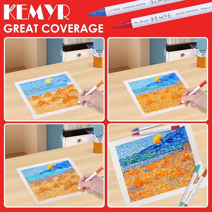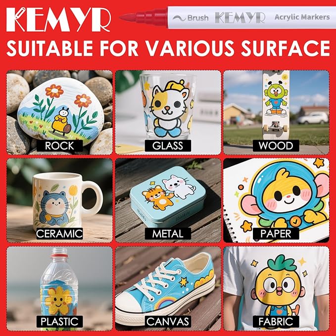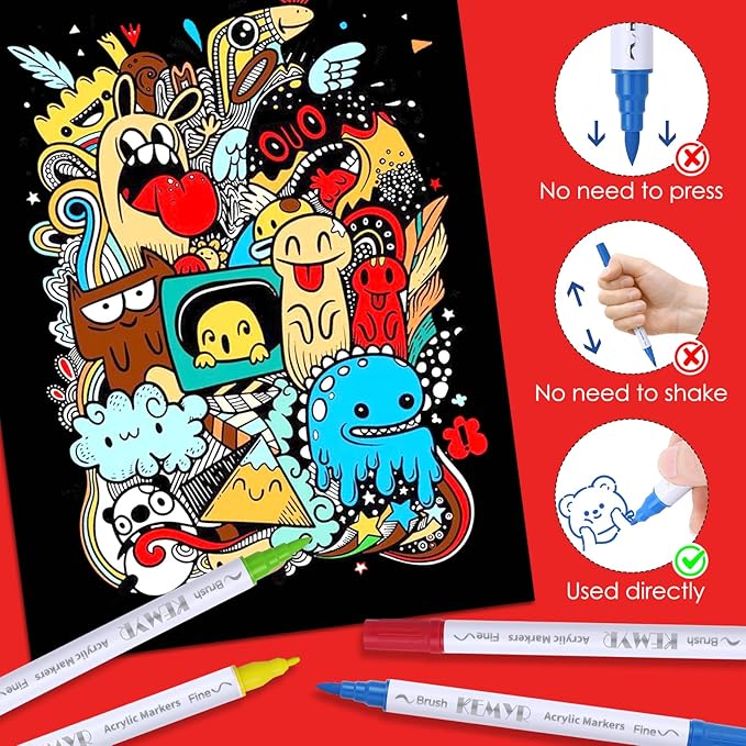 - Dual Tip Acrylic Paint Pens----Each KEMYR pen is equipped with a 1 mm fine tip for lines and details work, and a 1 - 5 mm brush tip for filling large areas and coloring. By changing the brush pressure, you can create different strokes, saving the trouble of changing tips.