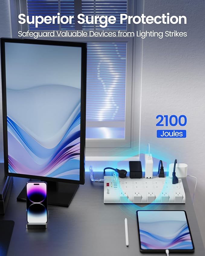 - 【Superior Surge Protection】 Composed of 3 level complementary surge protector circuit, including TVS, MOV, GDT, the surge protector flat plug has a 2100-Joule energy rating providing a reliable power extension cord to protect your devices. It secures your electronic units from power spikes, lightning strikes, or fluctuations.