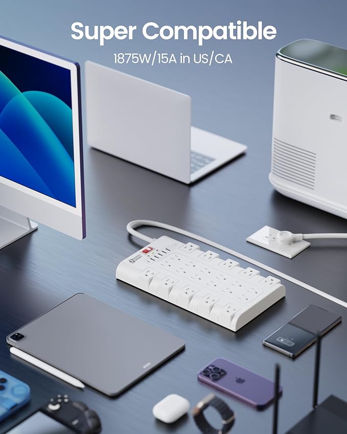 - 【28-in-1 Versatile Power Strip】 FCC, RoHS safety certified, with extension cord and flat plug certified by UL. Superdanny power strip surge protector has 22 grounded 3-prong outlets and 6 USB ports, providing power for all devices that you need to plug in at one location. Perfect for gaming or media set up, surround sound system, TV, phone, tablet pc, laptop, computers, lamps, and other devices simultaneously.