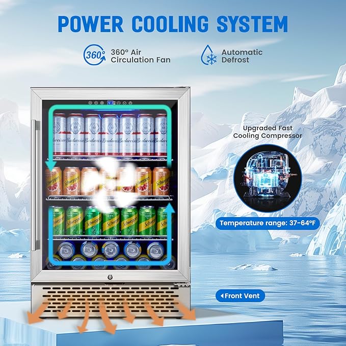 - 【Powerful & Quiet Cooling Compressor】: The under counter beverage refrigerator is equipped with a high-performance compressor that can achieve fast cooling and maintain a constant temperature range of 37 to 64° F. The low-noise operation ensures a quiet environment, allowing you to enjoy your favorite beverage at work or during leisure time