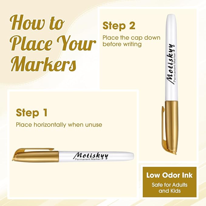 - Premium Ink: Fine point metallic markers pens use premium-quality low-odor, non-toxic, acid-free ink with good coverage, creating a long-lasting opaque and glossy effect on light and dark surfaces. Note: After use, you need to cover the pen cap to prevent the ink from drying