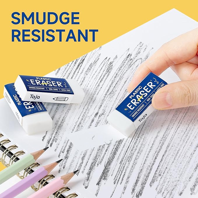 - Clean & Smudge-Free Erasing: Made from soft, latex-free, non-abrasive materials that erase smoothly without tearing or scratching paper. Taja erasers remove pencil marks cleanly and efficiently without leaving smudges or residue. Perfect for tests, sketches, notes, or designs, delivering precise, mess-free corrections every time.