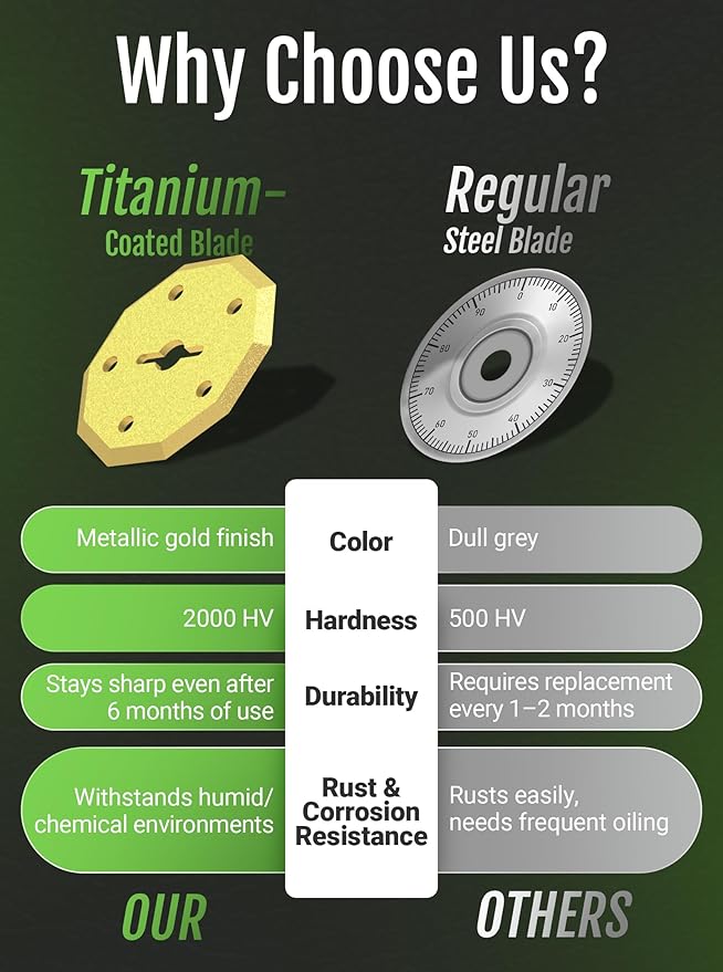 - TITANIUM-COATED BLADE: Tired of box cutter blades that dull after just a few uses? Our electric scissors are equipped with a titanium-coated SKS7 blade, a premium high-carbon alloy steel that delivers razor-sharp precision even after 100,000+ continuous cuts.Unlike ordinary blades that wear down quickly, SKS7 offers: higher hardness, superior wear resistance and extended cutting life β perfect for high-frequency, professional use