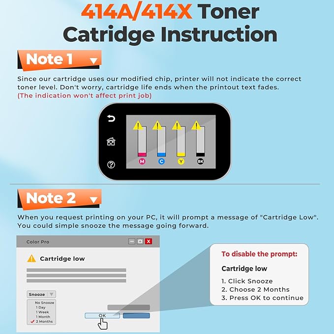 - Our 414X Toner cartridges 4 pack high yield have large capacity provide long-lasting print durability and reduced frequency of replacement; Specially designed toner formula ensures clear, natural, vibrant printing and prevents toner leaks.